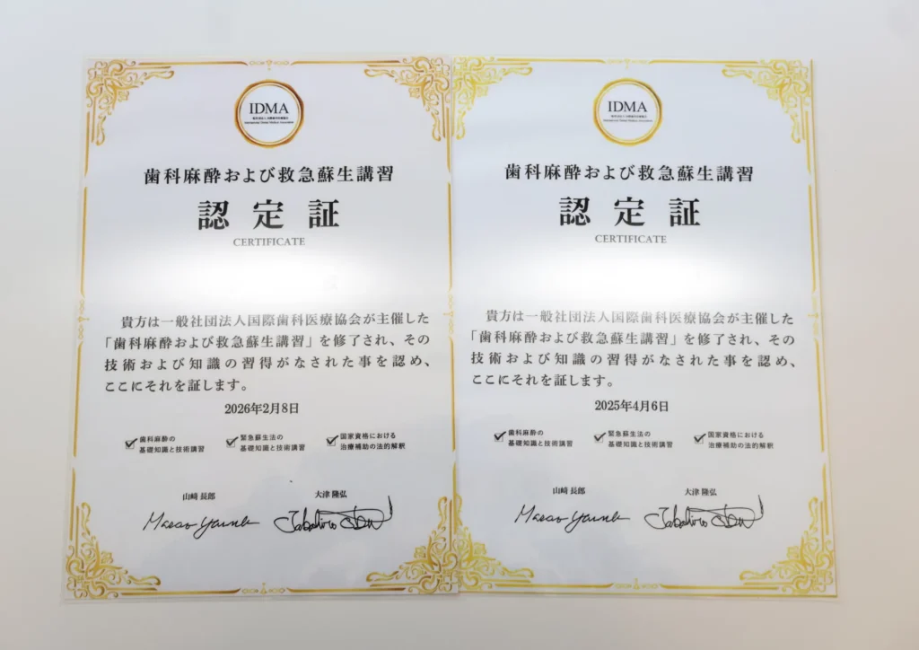 その一環として、麻酔に関する知識・技術を学び、認定を取得した歯科衛生士が在籍しております。